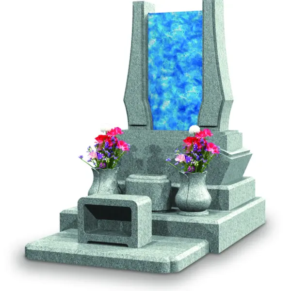 透明感のあるブルーガラスを主役にした、現代的で洗練されたデザイン墓石です。